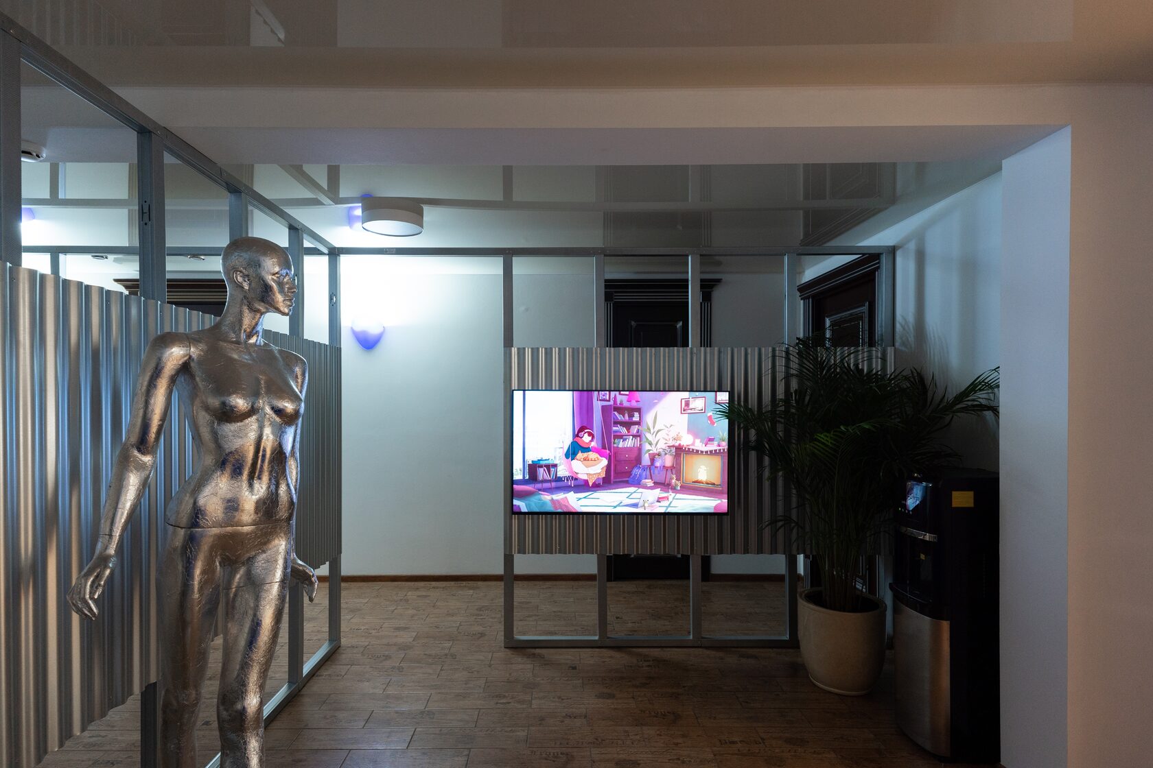 Помещение сдавалось с отделкой в неоклассическом стиле: коричневая цветовая гамма, тяжёлые филёнчатые двери, глянцевый натяжной потолок и неровные стены. Мы решили пойти по пути контраста: добавить яркие акценты за счет краски и цветной подсветки, и применять только недорогие индустриальные материалы. Каркасы перегородок и стойка ресепшн сделаны из оцинкованного профиля Кнауф, а облицовка — из профнастила в натуральном стальном цвете.