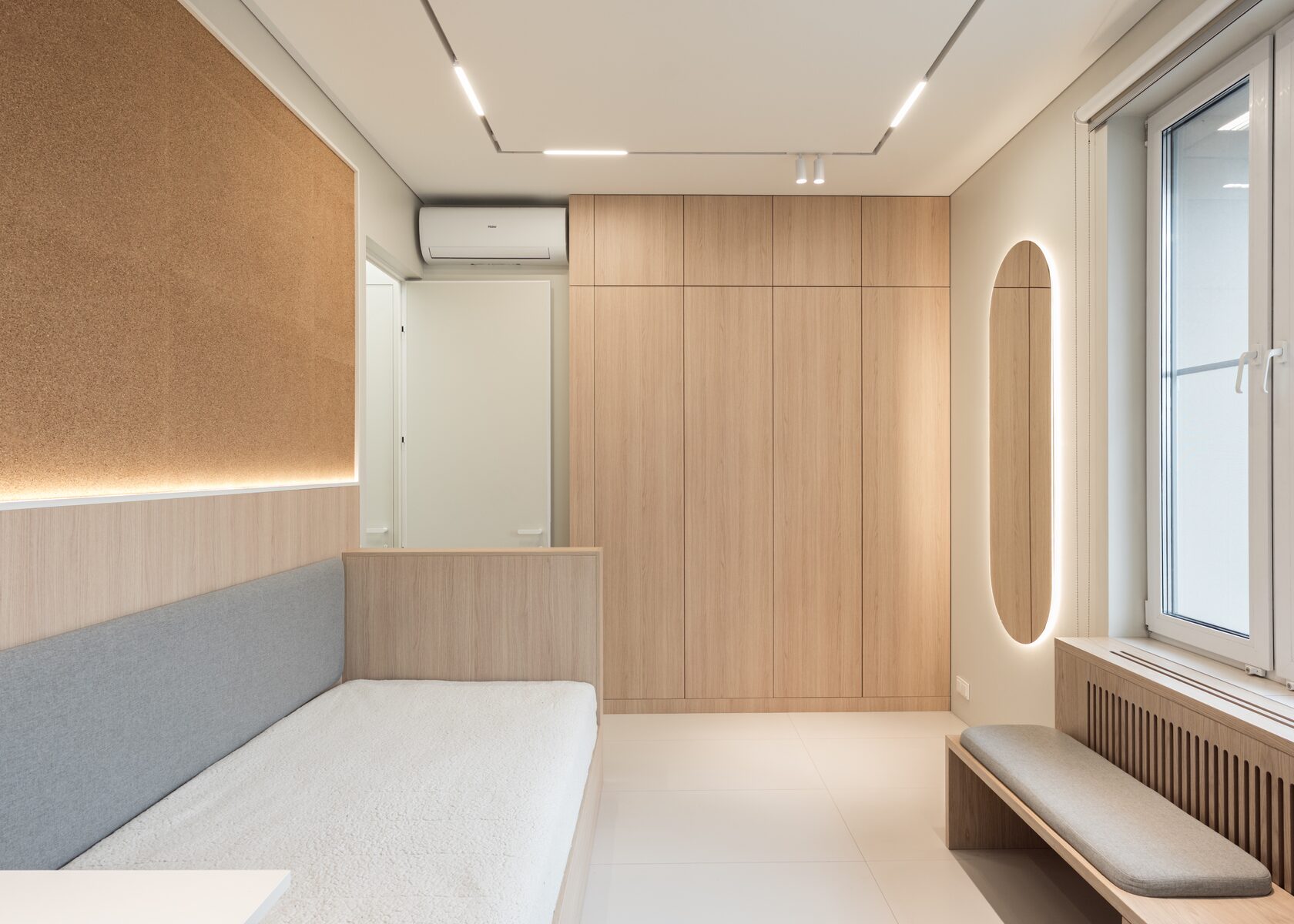 Особым элементом интерьера стала стенка за кроватью, выполненная из молочного сотового поликарбоната. За ней — встроенная по периметру подсветка, которую можно настраивать по яркости и цвету в зависимости от настроения. Когда свет выключен, стенка почти сливается с окружающим интерьером и выглядит нейтрально.