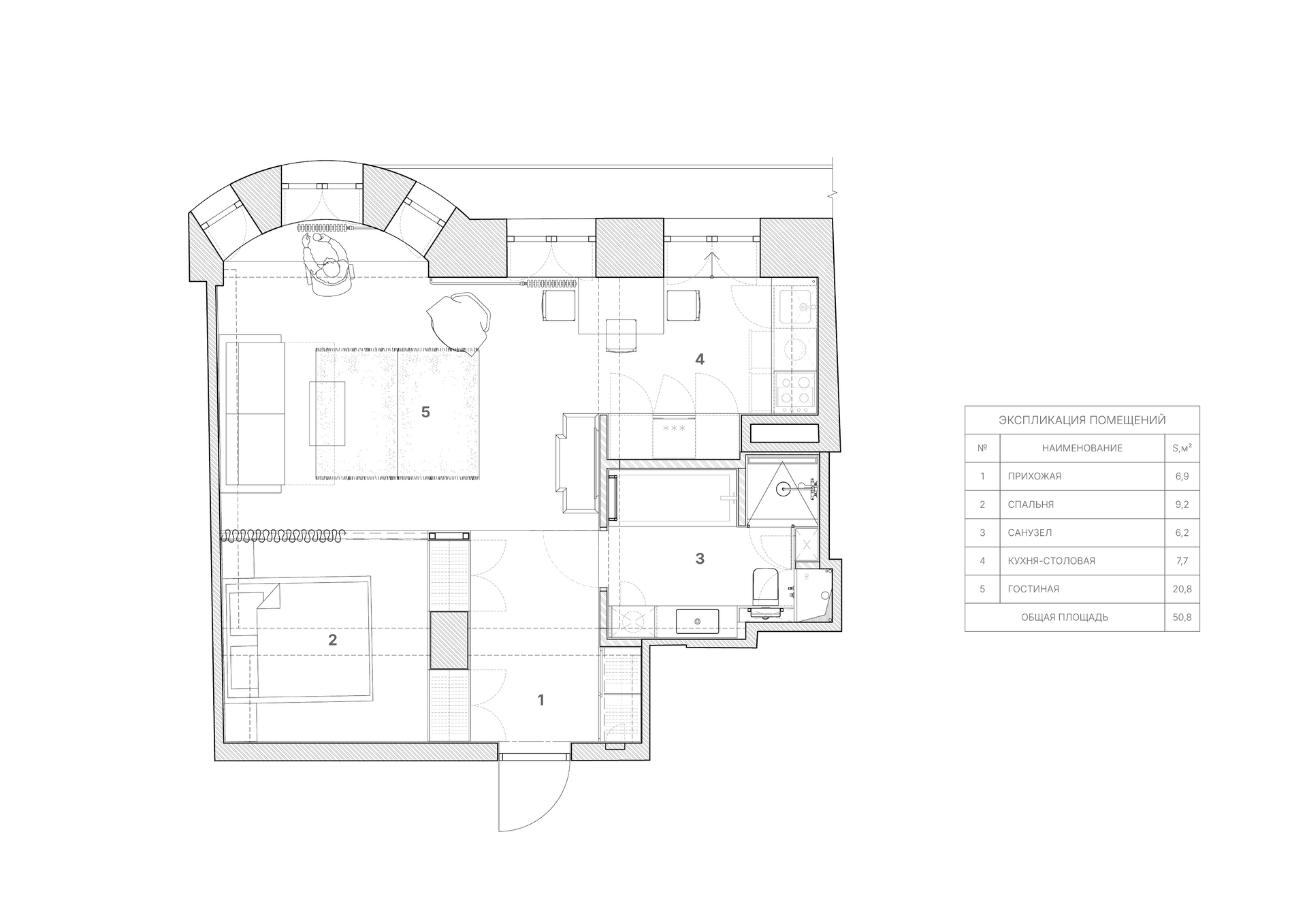 Квартира впечатляет высокими потолками (3,8 метра), эркерным окном и собственным балконом. После демонтажа советской планировки, которая делила пространство на множество маленьких комнат, нужно было создать новый дизайн-проект — квартира предназначалась для сдачи в аренду. Это определяло бюджет и стиль: простые строительные решения, недорогая готовая мебель и минимум индивидуальной заказной мебели — только по необходимости.
